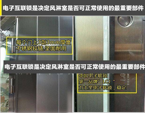 >>雙門電子聯鎖:風淋時兩扇門同時閉鎖,時間未到無法打開,保障強制員工吹淋,雙門電子互鎖,只可打開其中的一扇門;